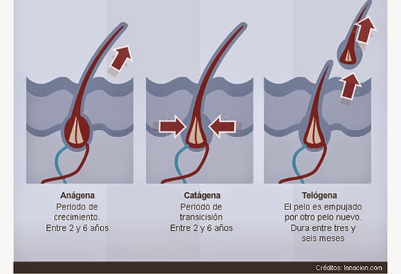 El cabello tiene un ciclo de vida que se renueva constantemente, por tanto es normal perder pelo a diario, porque debe dejar paso a uno nuevo. La duración del ciclo depende de la edad, la zona del cuerpo, longitud y grosor del cabello o vello. Este ciclo consta de 3 fases: crecimiento (anágeno), transición y reposo (catágeno) y caída del pelo empujado por otro pelo nuevo (telógeno). A continuación, otra vez fase anágena de crecimiento de un nuevo pelo.