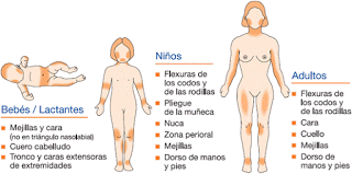 - FASE ADOLESCENTE-ADULTO: Aunque ya a partir de la pubertad la incidencia de la patología disminuye, un 20-30% de los pacientes siguen sufriendo brotes crónicos. Los síntomas se manifiestan en cara, nuca, codos, rodillas, muñecas, tobillos y pies.