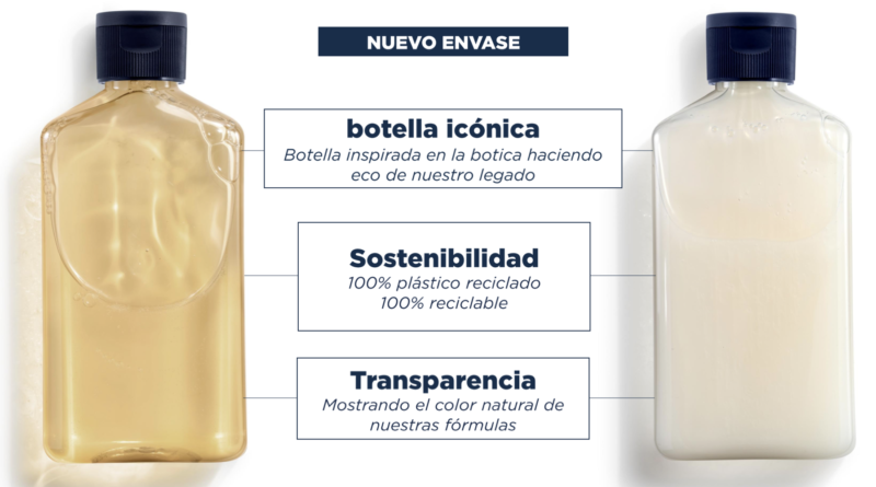 Ahora renueva todos sus gamas y también los envases de sus champús: ahora son transparentes para mostrar el color de sus fórmulas y 100% plástico reciclable y reciclado.