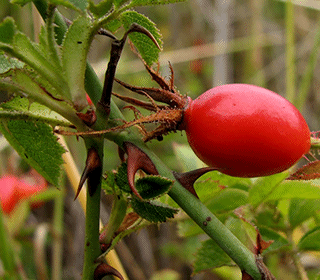 Cuando sus pétalos caen, se desarrolla su fruto, el escaramujo, ovalado y rojizo, y lleno de semillas. El fruto es rico en ácido ascórbico (vitamina C), por ello su acción antioxidante, y en menor proporción contiene flavonoides, taninos y betacarotenos. De las semillas del fruto se extrae el aceite.
