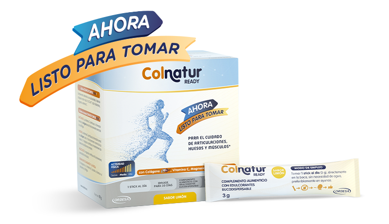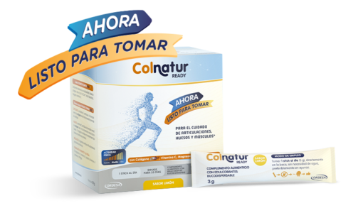 COLNATUR READY es un complemento alimenticio a base de colágeno nativo tipo II, ácido hialurónico, magnesio y vitamina C.