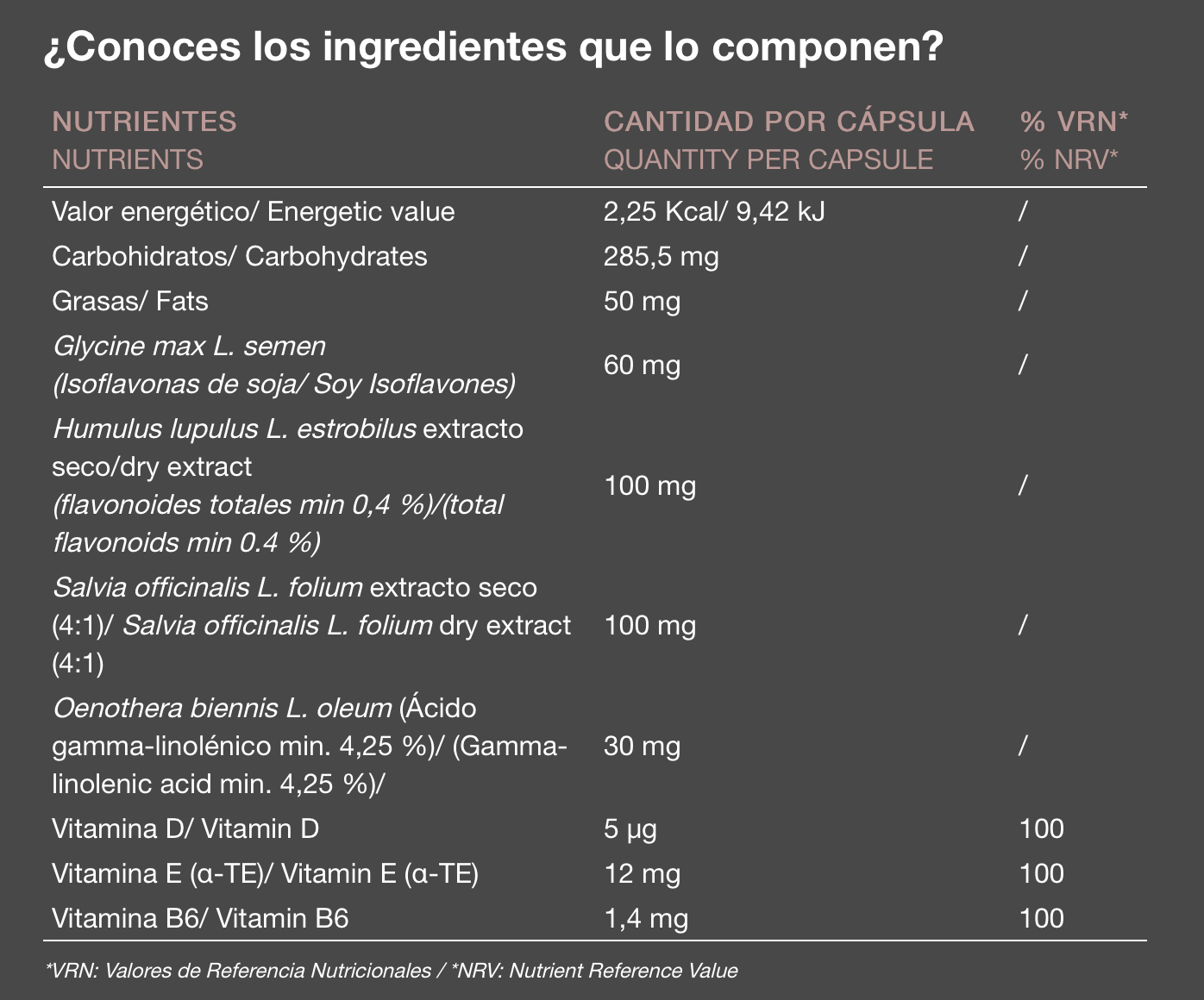 Complemento alimenticio a base de isoflavonas de soja, extracto de lúpulo, salvia y vitaminas.