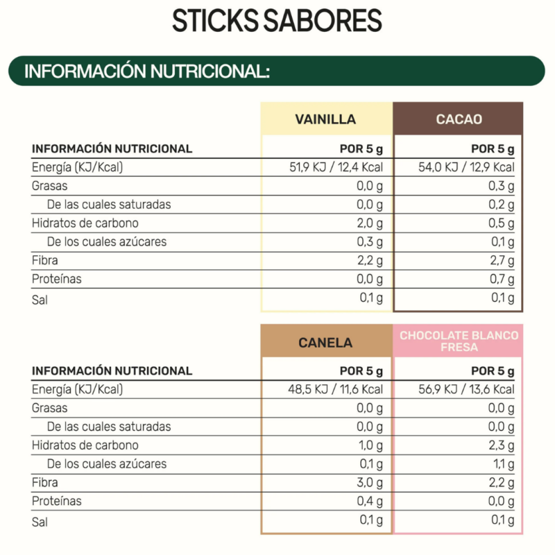Sticks para personalizar el sabor de tus complementos en polvo neutros, como la proteína neutra láctea o vegana.