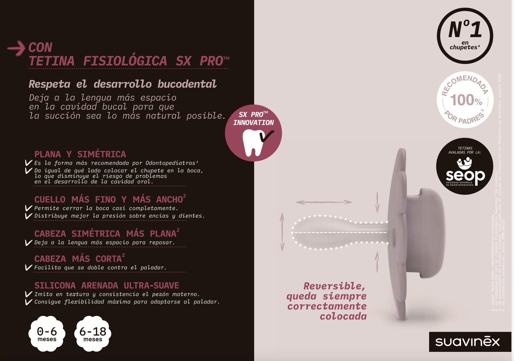 Tetina de fisiológica de silicona arenada ultra suave SX PRO. Cabeza simétrica, plana y corta. Cuello más fino y más ancho. Adaptada a la succión natural, respeta el desarrollo bucodental.