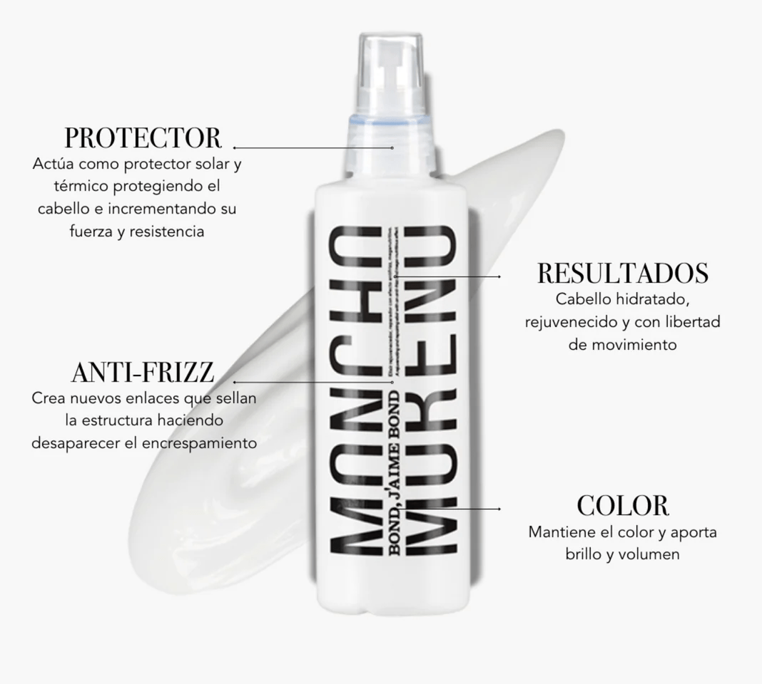 MONCHO MORENO BOND, J ´AIME BOND: Tratamiento acondicionador restaurador sin aclarado con filtro solar que absorbe la radiación ultravioleta.