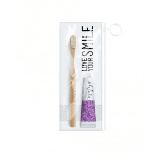 Kit de viaje con mini cepillo dental de bambú, alternativa ecológica al plástico, y mini pasta dental violeta menta 75ml. Todo en un neceser transparente.