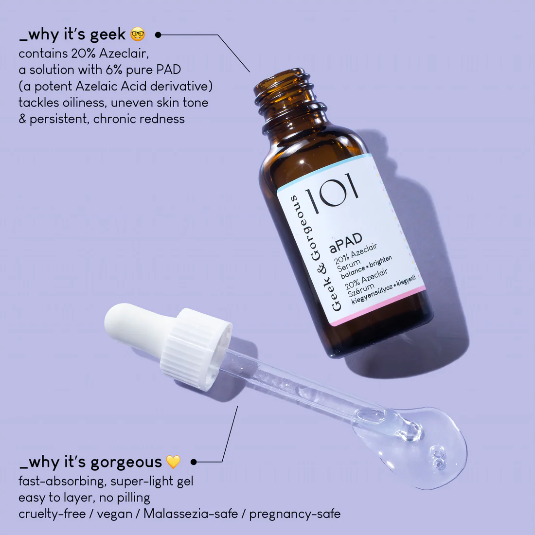 Serum con fórmula de base acuosa ligera con un 20% PAD (derivado del Azeláico).