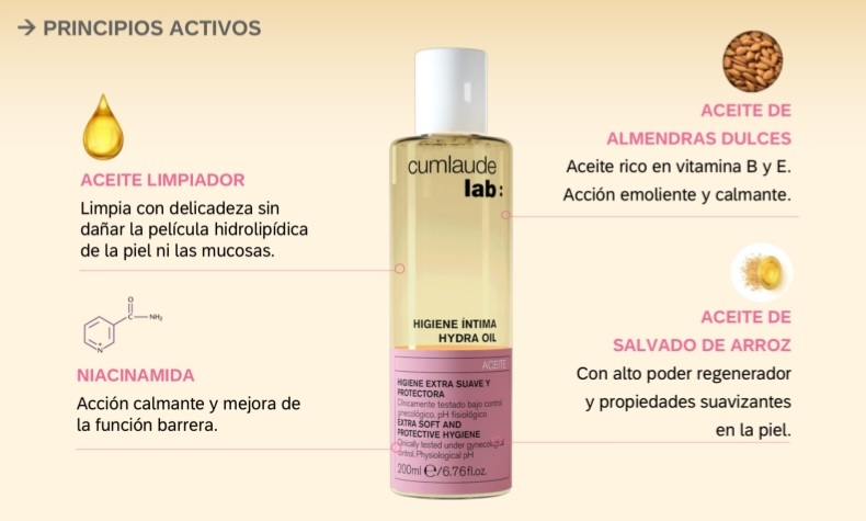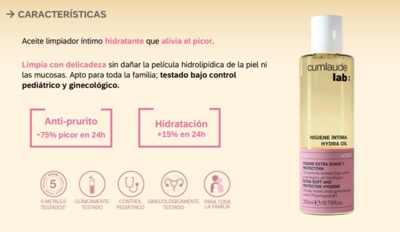 Aceite limpiador íntimo e hidratante que alivia el picor.